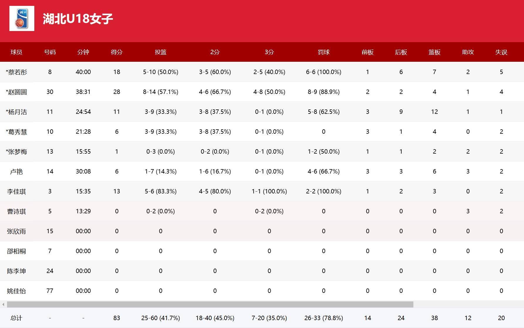 杨月洁依然是内线支柱,拿下11分12篮板的两双成绩。赵圆圆则担任得分尖刀,14投8中砍下28分。主力控卫蔡若彤也有18分7篮板进账。比较意外的是来自十堰的替补后卫李佳琪,在出场的短短15分钟时间里拿到13分成为奇兵。